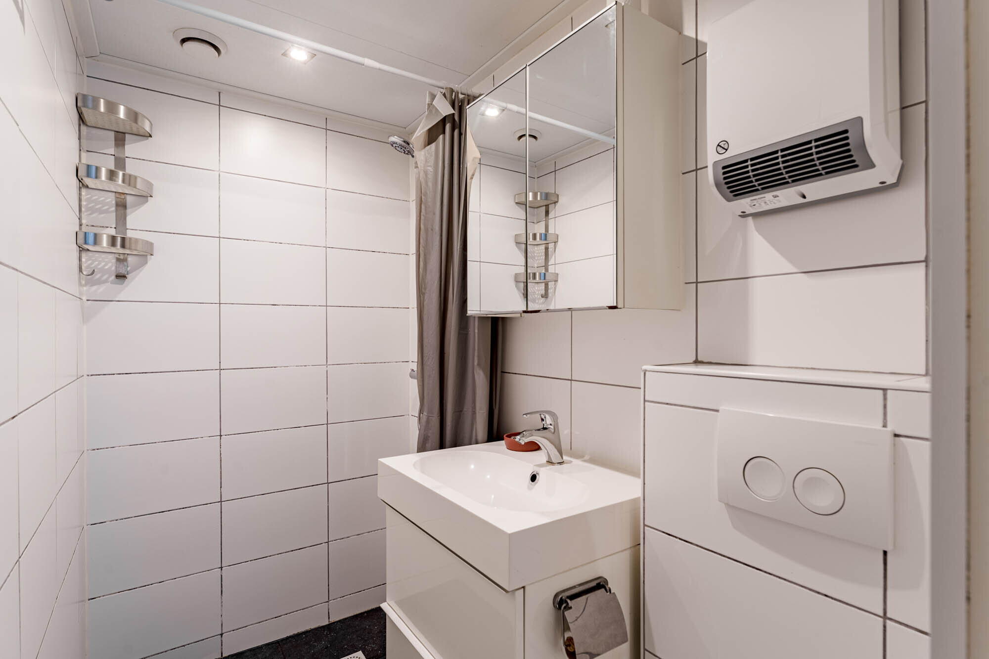 - Badkamer met een tegelvloer, toilet (duravit), bijverwarmer (elektrisch), enkel wasmeubel met spiegelkast en onderkast;